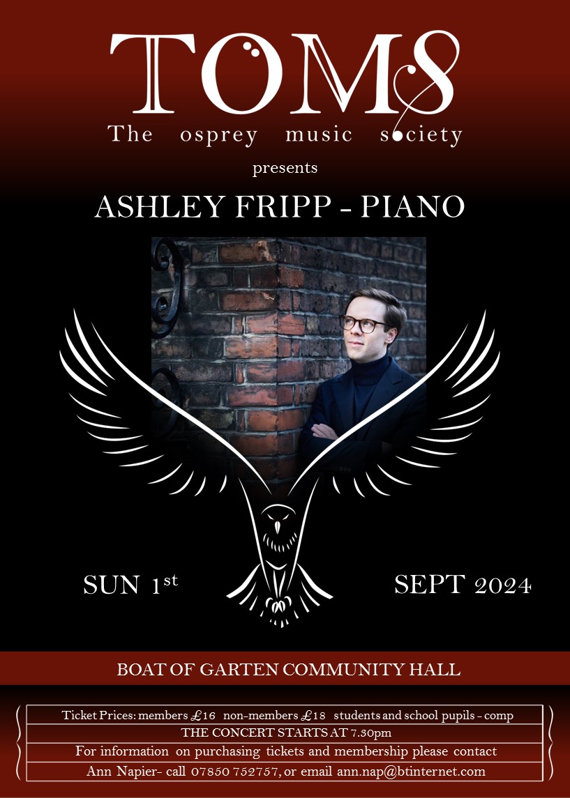 Ashley Fripp returns for his 7th visit to Boat of Garten as a guest of TOMS. His programme will consist of music by Bach, Schumann, Beethoven, Brahms and finishing with Chopin’s Sonata No 3, op 58.
